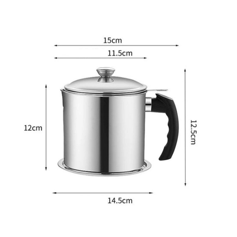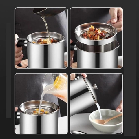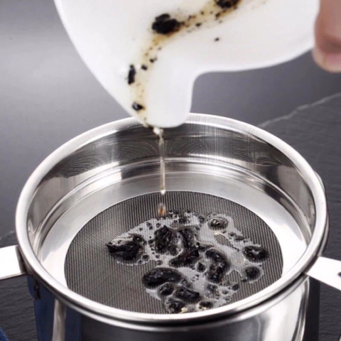 Ca được làm bằng inox 304. Bề mặt nhẵn, bền, chống ăn mòn, miệng cốc có thiết kế màng lọc giúp lọc cặn dầu hiệu quả, đáy phẳng có thể đun trực tiếp hoặc sử dụng như ca thông thường.